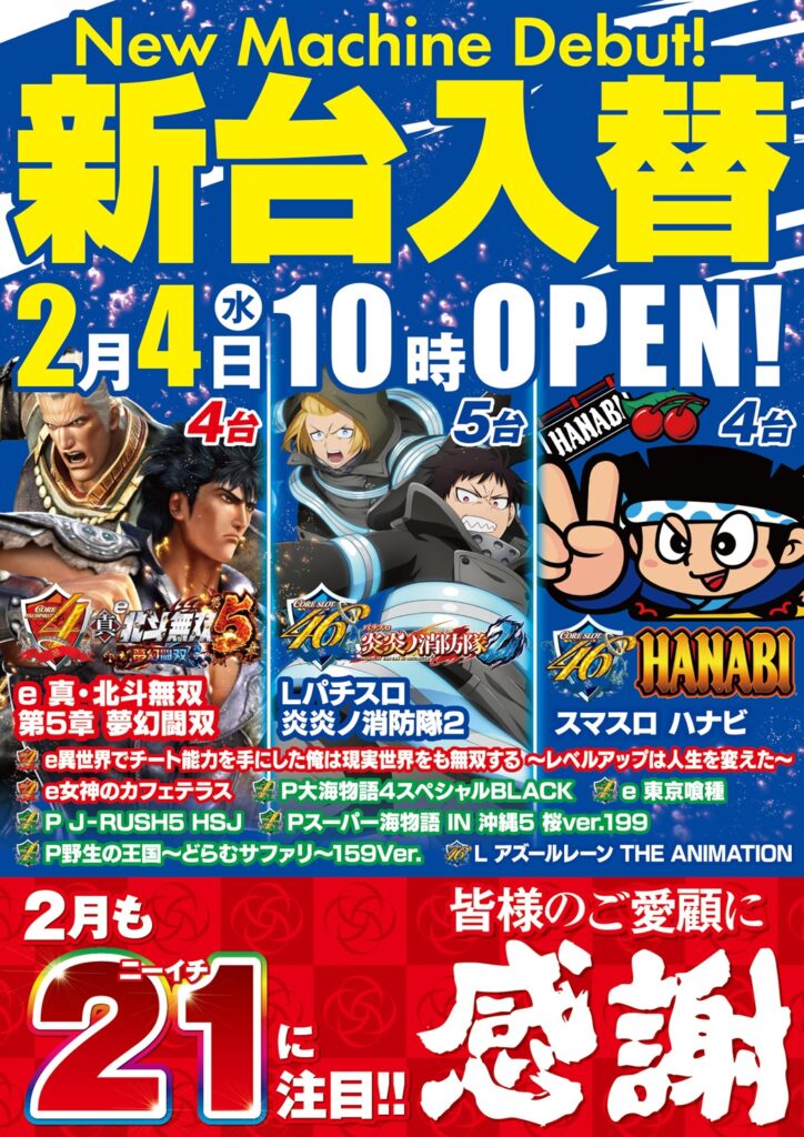 2月4日(水)、新台入替オープン